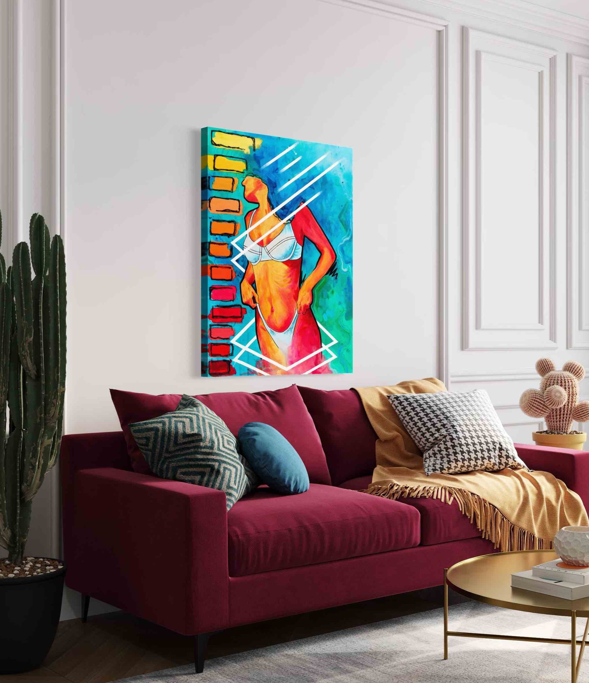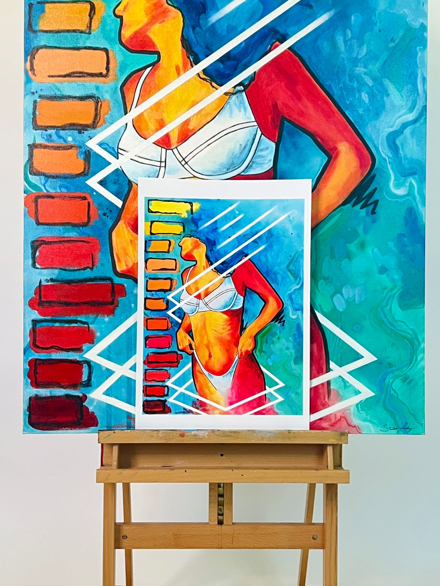 About the Original: "Golden Hour" captures the essence of summer. Abstract swirls and flowing marks imbue the background with energy and movement, echoing the dynamic spirit of the season. The artwork evokes a sense of brightness and excitement, portraying summer as a time filled with life and fun. Through its vivid colors and dynamic composition, the piece invites viewers to embrace the warmth and joy of golden hours spent under the sun.