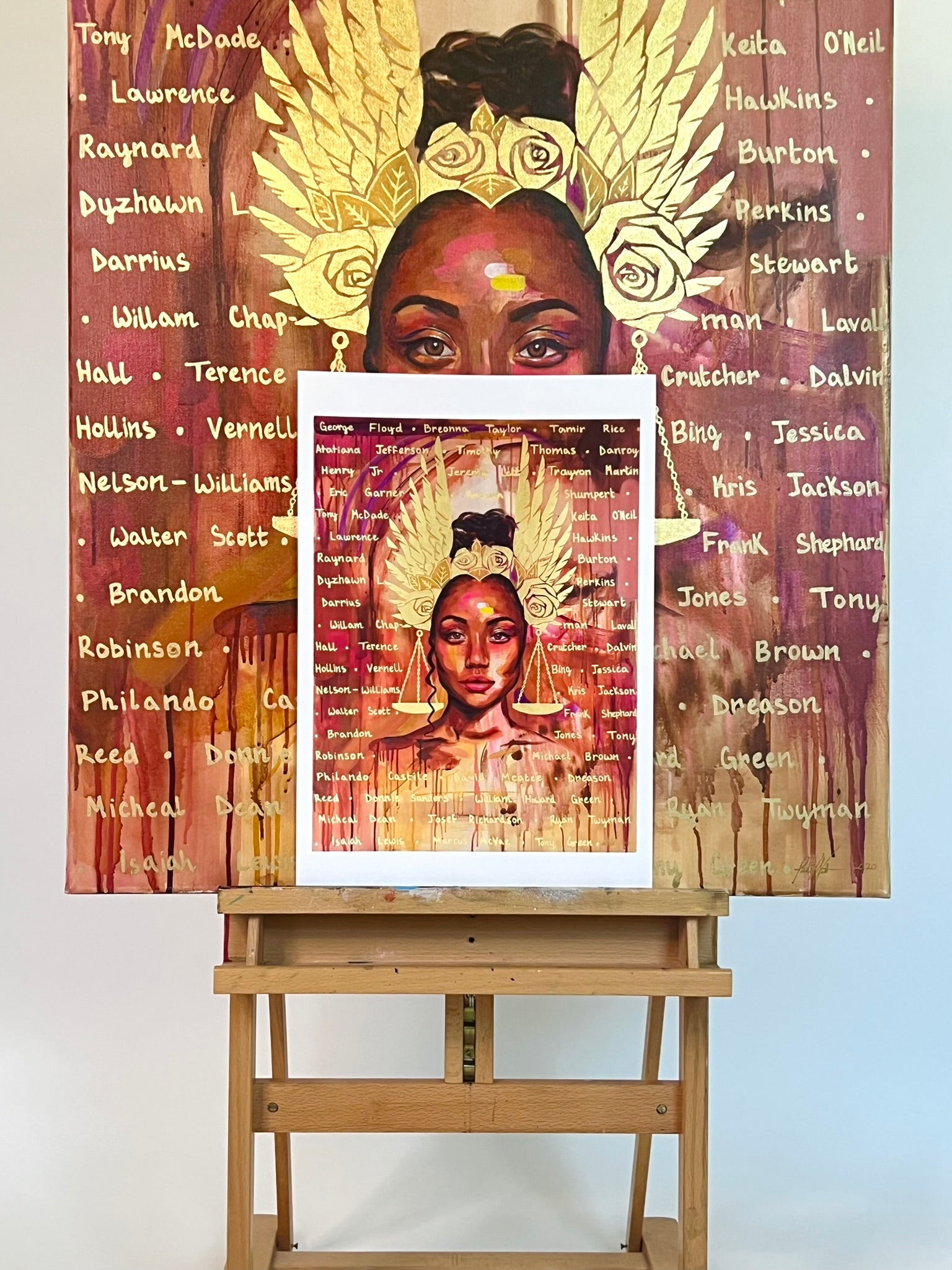 About the Original: This powerful Black Lives Matter painting features a black woman with justice scales for earrings, symbolizing the pursuit of equality. Her beautiful golden crown signifies strength, resilience, and dignity. Inscribed in gold throughout the painting are names of victims of police brutality, honoring their memories and underscoring the ongoing fight for justice. This piece serves as both a tribute and a call to action, reminding viewers of the profound human cost of systemic racism and the enduring need for change.